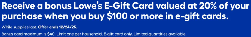 圣诞折扣:Lowe’s $100+ eGift card现有20% bonusPost published:12/22/2025Post category:Bonus / Discount / Gift cardPost comments:0 CommentsBonus最多$40。所以直接买一张$200的GC就OK。活动截至12/24。 Tags: Lowe’s Cancel replyYou must be logged in to post a comment.