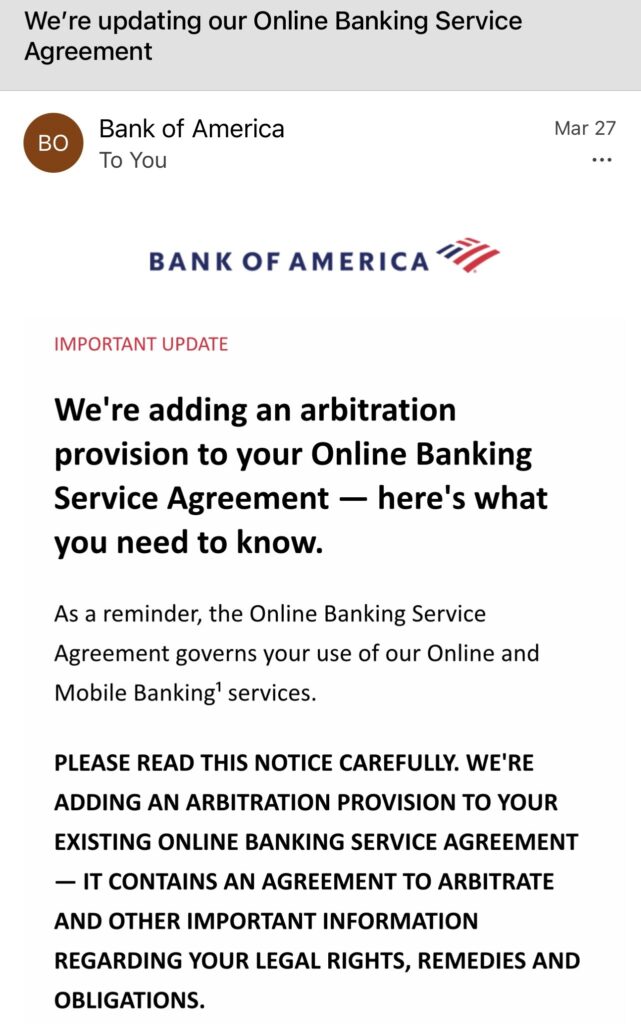 BOA用户最近都会收到这封邮件。银行正在把 arbitration provision 加进你的 Online Banking Service Agreement。大多数争议将改为由 binding arbitration 解决,而不是普通法院诉讼。如果你平时只是正常用账户,这个条款不会影响你今天转账或刷卡,但它会影响你将来和银行发生纠纷时的法律路径。消费者保护资料普遍建议,如果合同给了你免费退出权,保留自己的法院诉讼选择通常更稳妥,因为退出后你仍然保有更多救济方式和谈判空间。强烈建议60天内选择退出。有问题请评论区留言讨论。