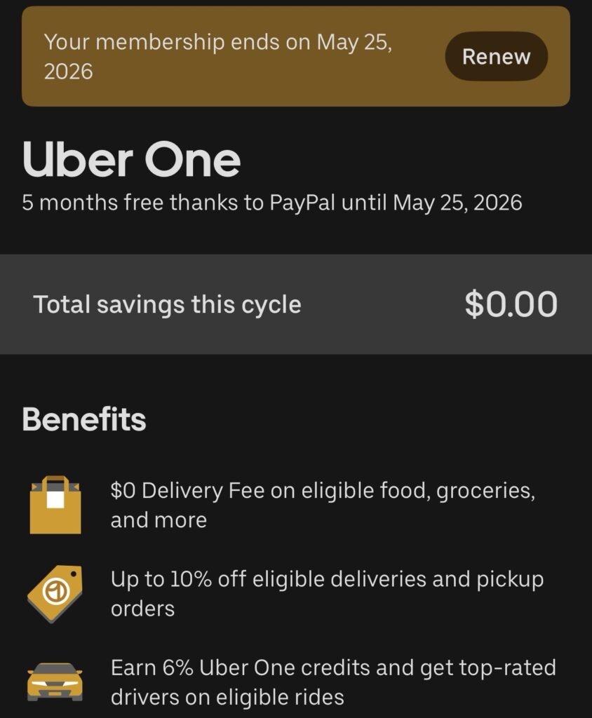 打开Uber或Uber Eat app就会看到这个offer。按提示添加Paypal账户后即可拿到会员。立即取消会员不影响到期日。