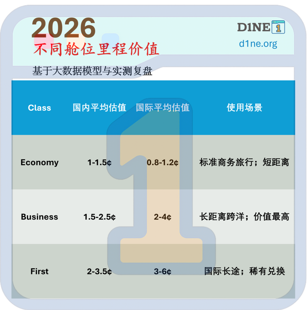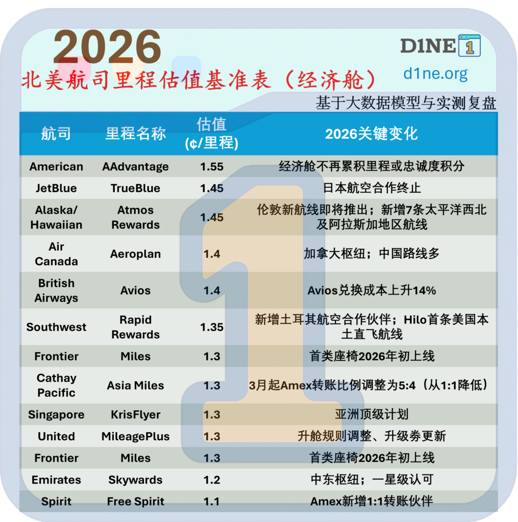 本基准表汇总了2026年13家北美及主要国际航司常用里程的估值数据。此估值基于权威旅行博客的最新分析数据,综合考虑了里程兑换灵活性、可用性、转账伙伴价值和最近的计划变化。