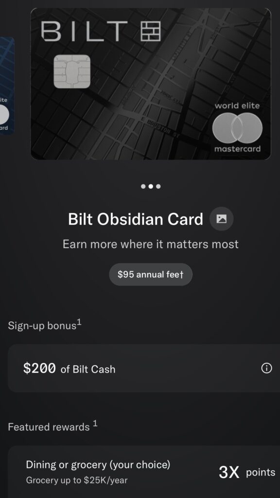 - Obsidian:$95年费,开卡奖励$200 Bilt Cash