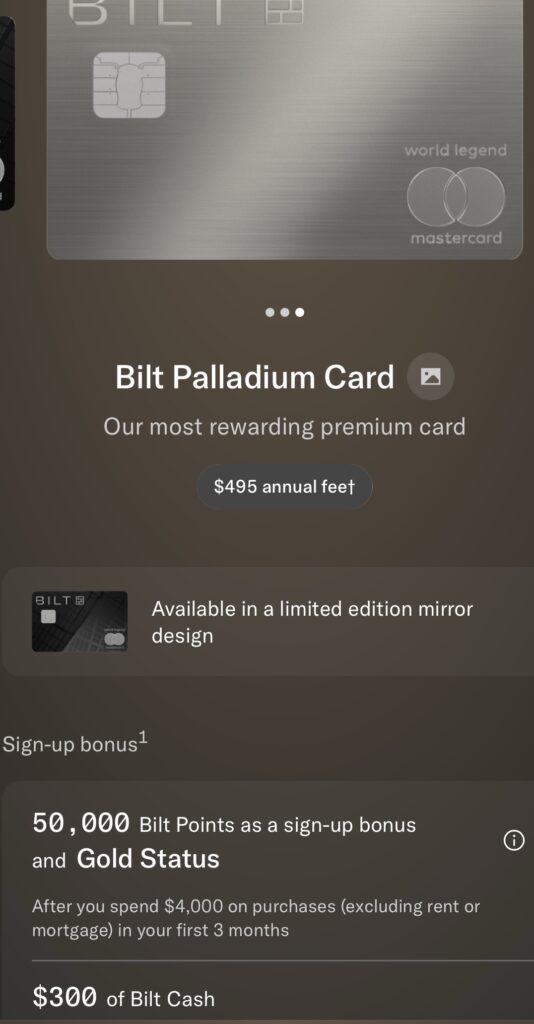 - Palladium:$495年费,开卡奖励$300 Bilt Cash,另外若3个月内消费$4000(不包括房租或房贷)可得50K Bilt points(价值约$800)